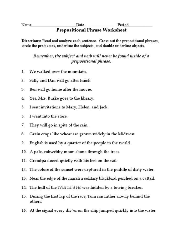 Underline the prepositional phrase in each sentence below. June sat on a bench against the wall. · she put her gloves in her . Home / exercises / prepositional phrases exercise. · the house on the hill. Time prepositions, prepositional phrases and more. This worksheet enables students to study the use of the structures and use them in sentences of their own. My dog loves his treats. Preposition worksheets to help learners understand correct use of prepositions. In these worksheets, students expand sentences with prepositional phrases. · the tiger behind the tree. Choose the right prepositions in, on, of, to, with to complete the following sentences. Complete the following sentences using appropriate prepositional phrases .